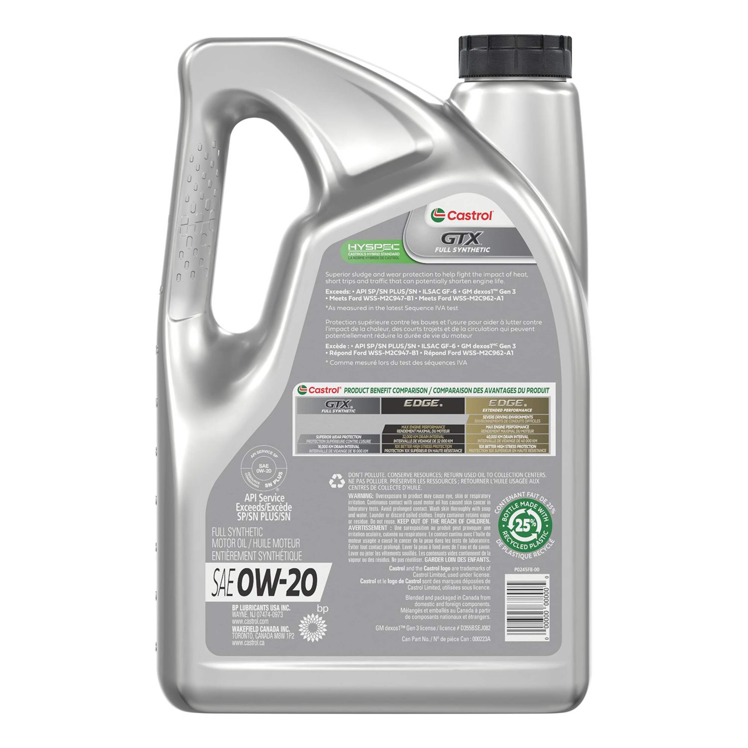 The Castrol GTX Full Synthetic 0W-20 Motor Oil is a premium full synthetic motor oil designed for newer vehicles requiring the 0W-20 viscosity grade. Castrol’s advanced synthetic formulation provides superior protection against heat, friction and engine deposits. This 0W-20 synthetic motor oil helps improve fuel efficiency and engine responsiveness while meeting industry specifications.