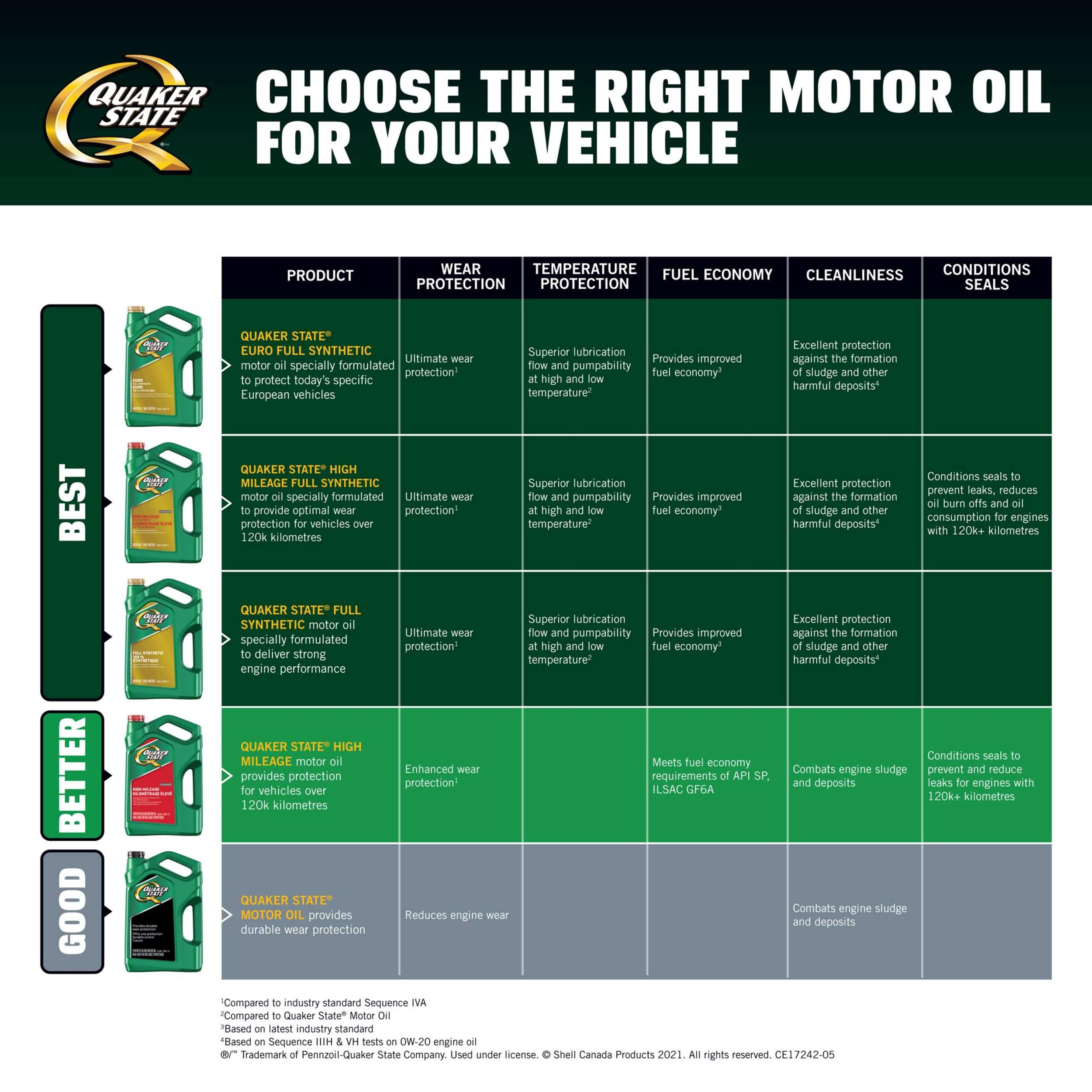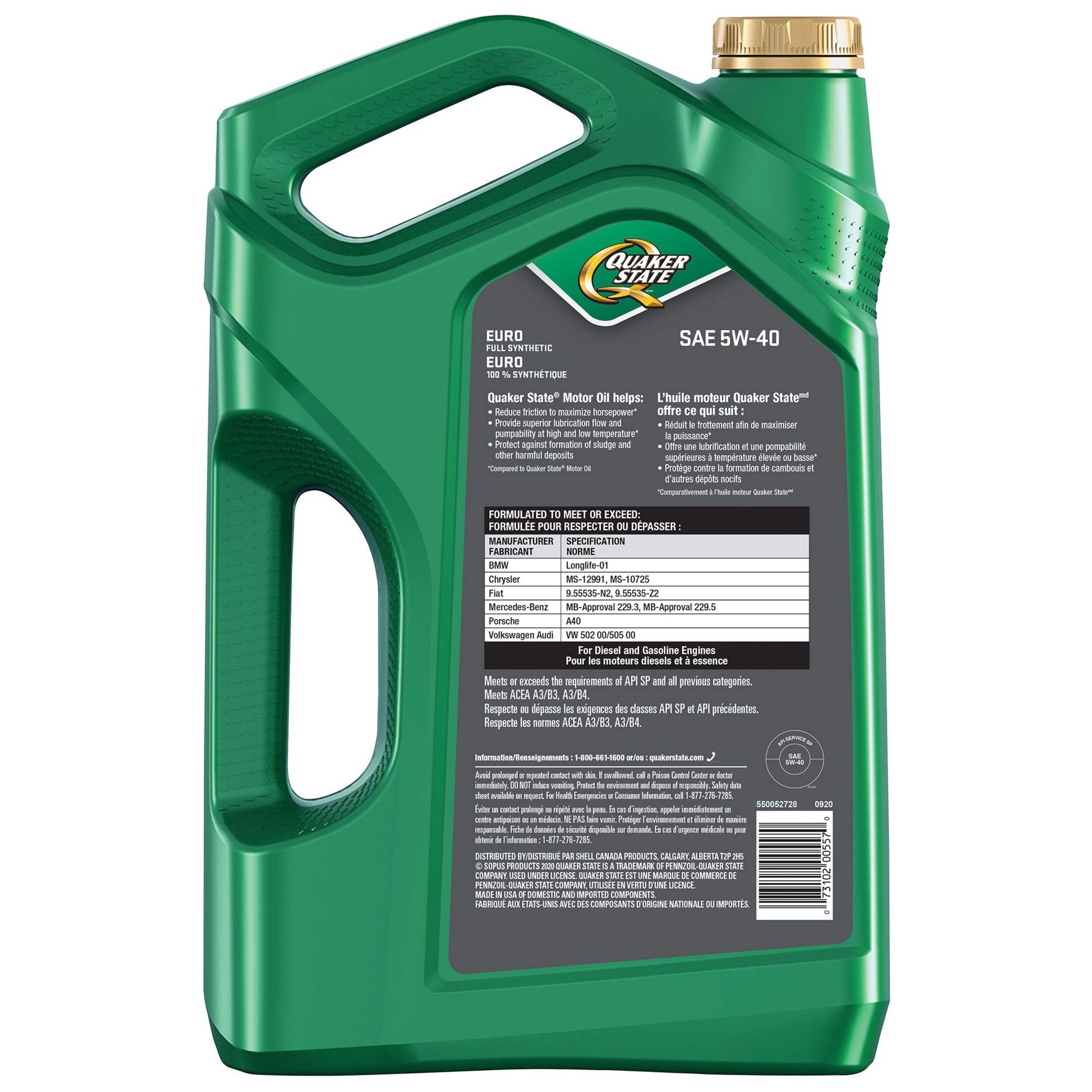 Quaker State® Euro Full Synthetic SAE 5W-40 Motor Oil is specially formulated to protect select European vehicles. It reduces friction to maximize horsepower, protects against the formation of sludge and harmful deposits, and provides improved fuel economy (Based on the latest industry standard). It is a high quality full synthetic motor oil specially formulated to offer protection required for European vehicles.